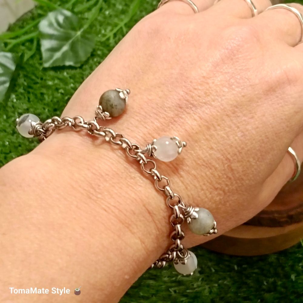 Bracciale artigianale Su Coccu in Labradorite e Agata dendritica, realizzato con pietre naturali da 8 mm e catena in acciaio da 0,5 mm.