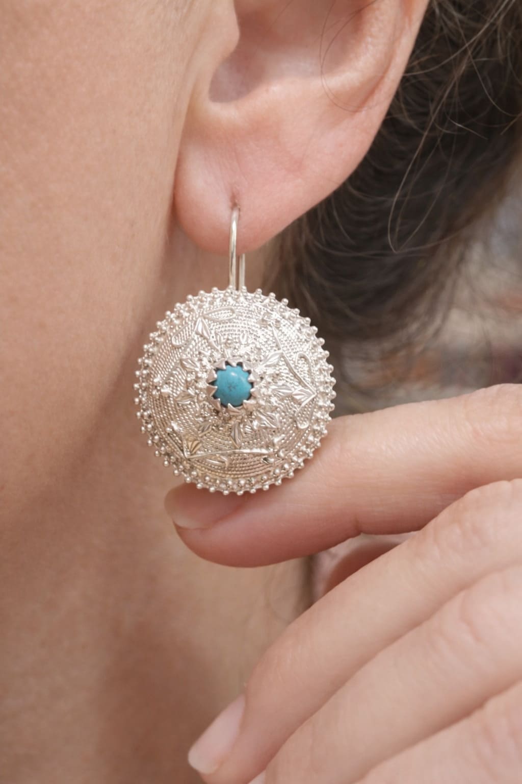 Orecchini in argento 925, lavorati in filigrana sarda con la tecnica della microfusione. Il design rappresenta il tradizionale bottone sardo, simbolo di abbondanza e prosperità nella cultura della Sardegna. La lavorazione esalta ogni dettaglio decorativo , mentre al centro un punto luce in turchese naturale dona equilibrio e carattere al gioiello. La monachella riprende il modello dell'orecchino antico, mantenendo uno stile autentico e senza tempo.