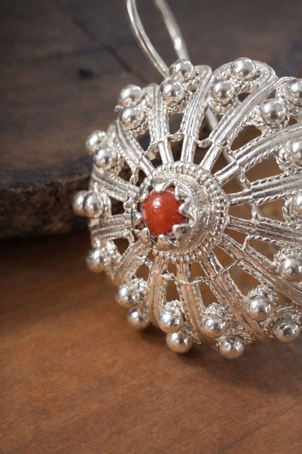 La lavorazione in filigrana sarda esalta ogni intreccio e dettaglio decorativo, mentre al centro un punto luce in corallo naturale dona calore, carattere e armonia al gioiello. Il contrasto tra l’argento 925 e il corallo richiama l’eleganza autentica dell’artigianato sardo.