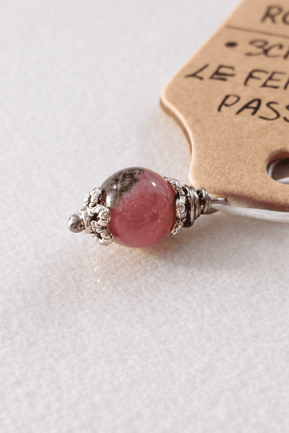 Realizzato rigorosamente a mano, l’amuleto è composto da una pietra dura di Rodonite da 8 mm, racchiusa tra due coppette in zama argentata e un perno in acciaio, materiali selezionati e completamente anallergici.